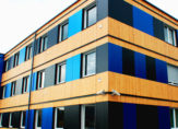Das gesamte System des Bürogebäudes basiert auf vorgefertigten Büromodulen (2.98m x 4,91m). Nach dem Entwurf des Grundmoduls ergeben sich die Abmessungen des Bürogebäudes. Die Raumzellen bestehen aus Massivholzelementen mit einer Stärke von 9,5cm. Das gesamte Bürogebäude (bestehend aus 84 Modulen) wird zu 100% vorgefertigt, wodurch sich der Montageaufwand auf der Baustelle auf ca. 1 Monat reduziert. Mittels farblich differenzierten, unregelmäßigen Feldern wird die monotone Holzfassade aufgelockert und gegliedert.